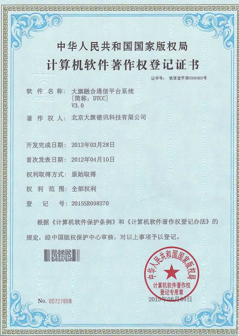 大旗融合通信平台系统(简称DTCC)V3.0 中华人民共和国国家版权局计算机软件著作权登记证书。